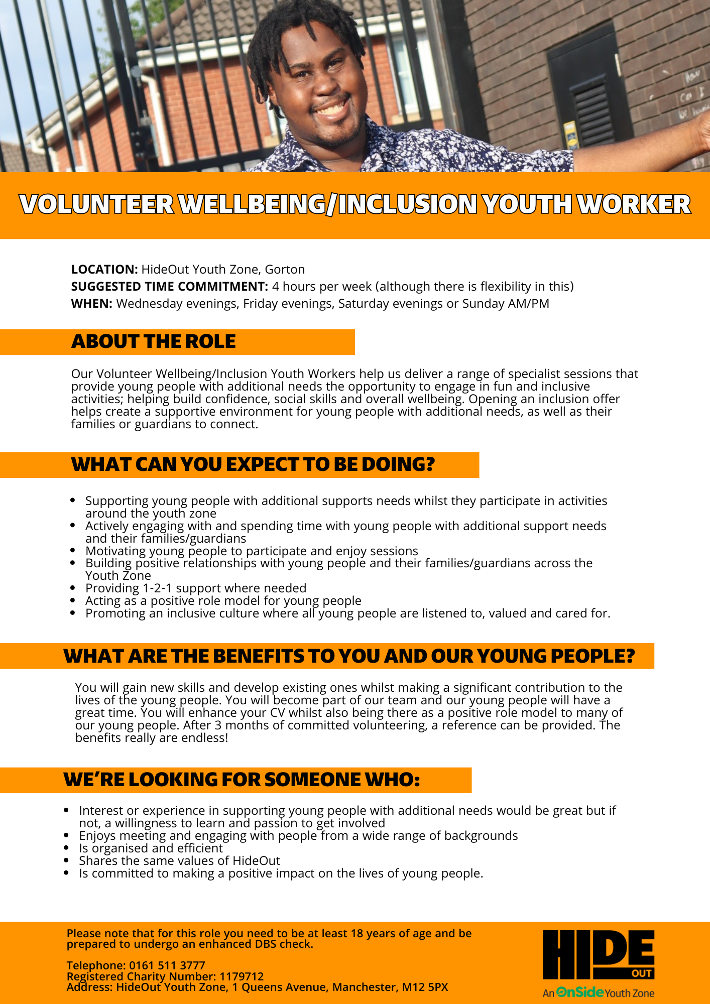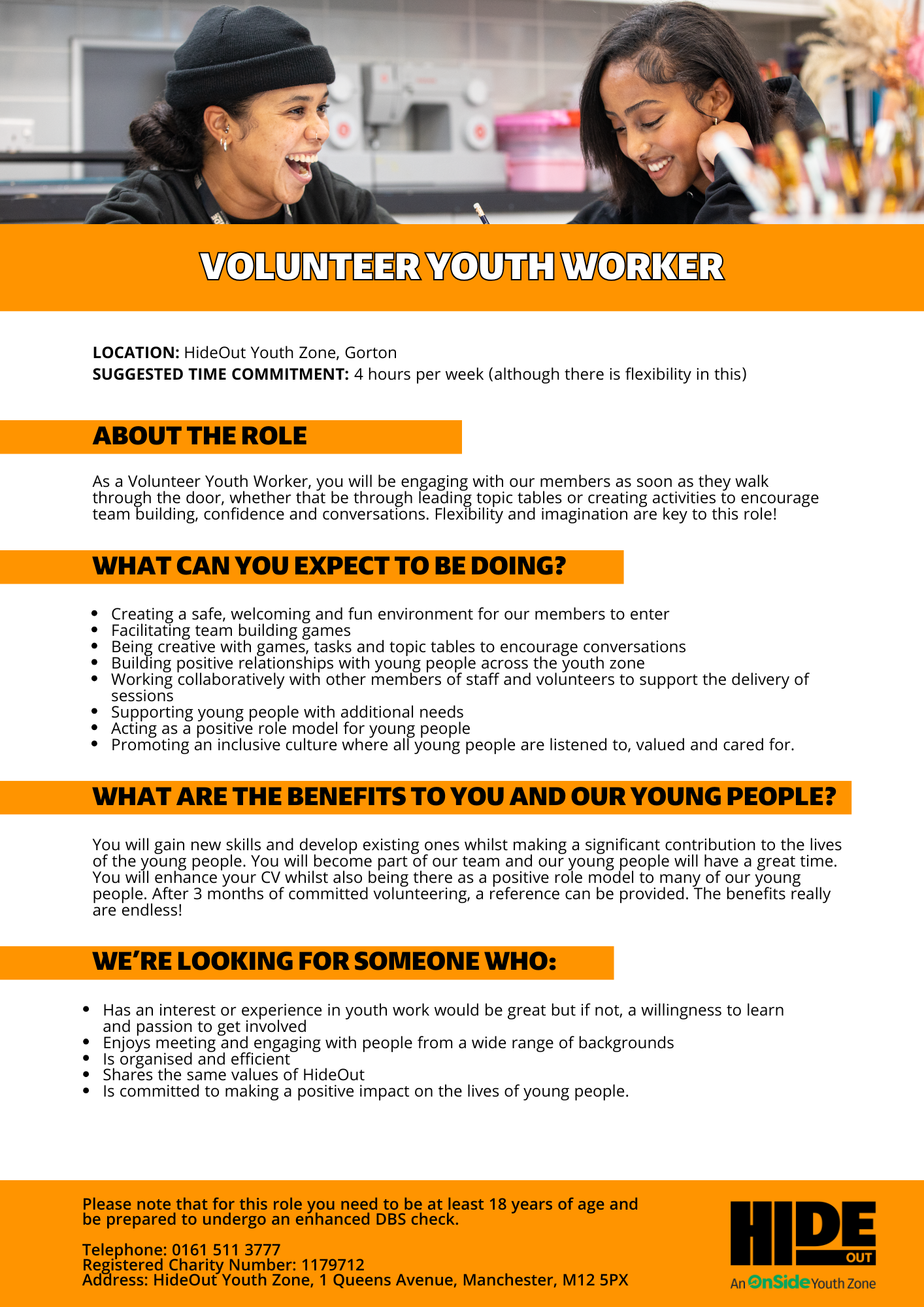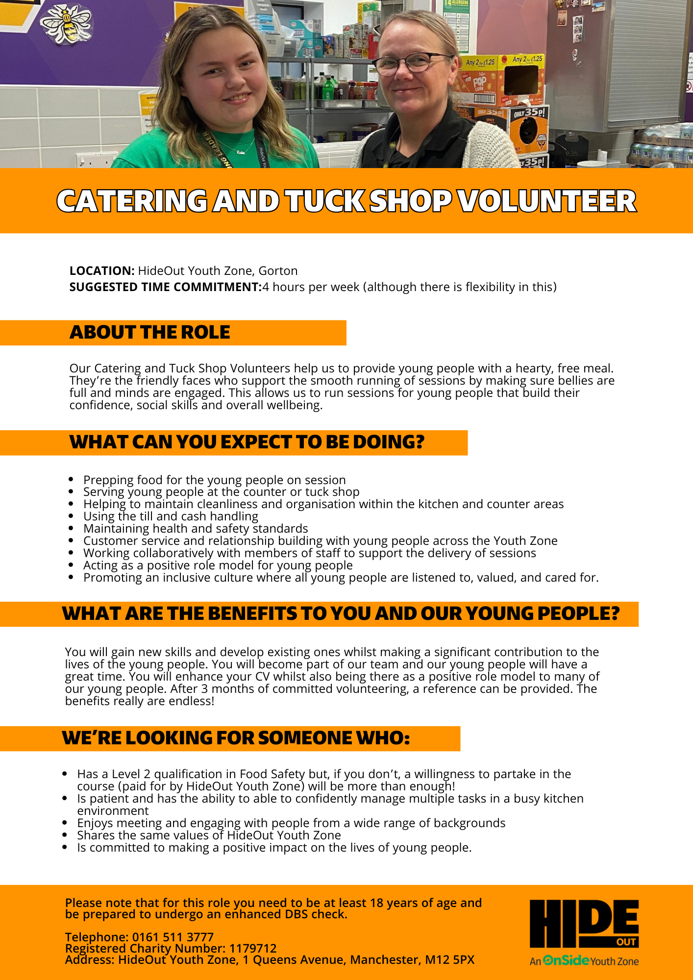 Please note that for this role you need to be at least 18 years of age and be prepared to undergo an enhanced DBS check.