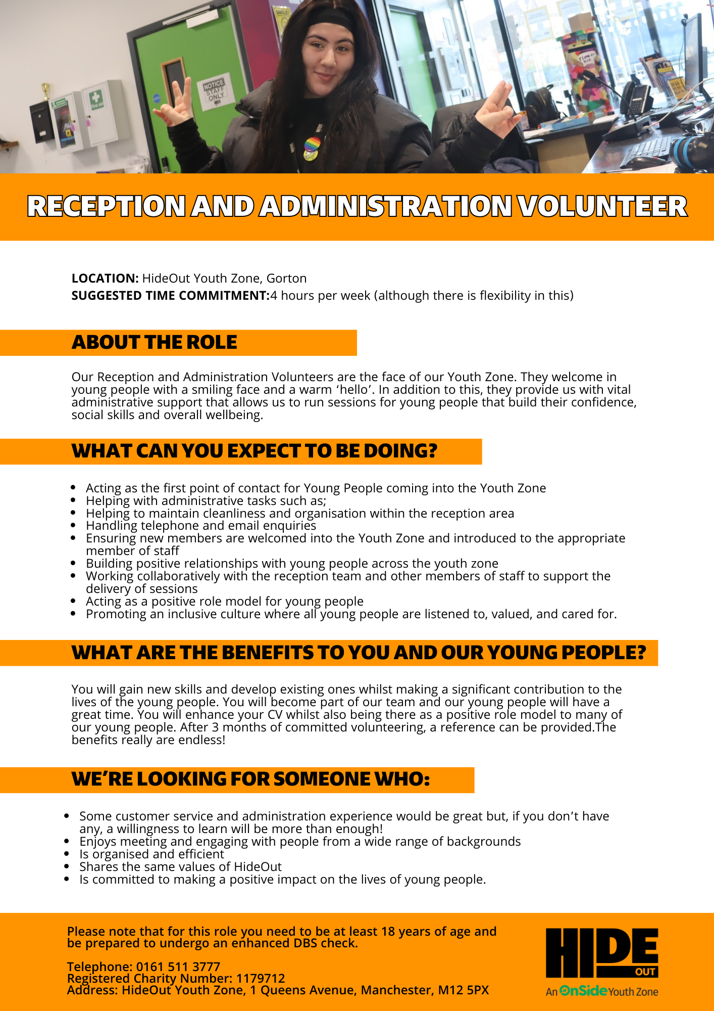 Our Reception Volunteers are the face of our Youth Zone. They welcome in young people with a smiling face and a warm ‘hello’. In addition to this, they provide us with vital administrative support that allows us to run sessions for young people that build their confidence, social skills and overall wellbeing.
