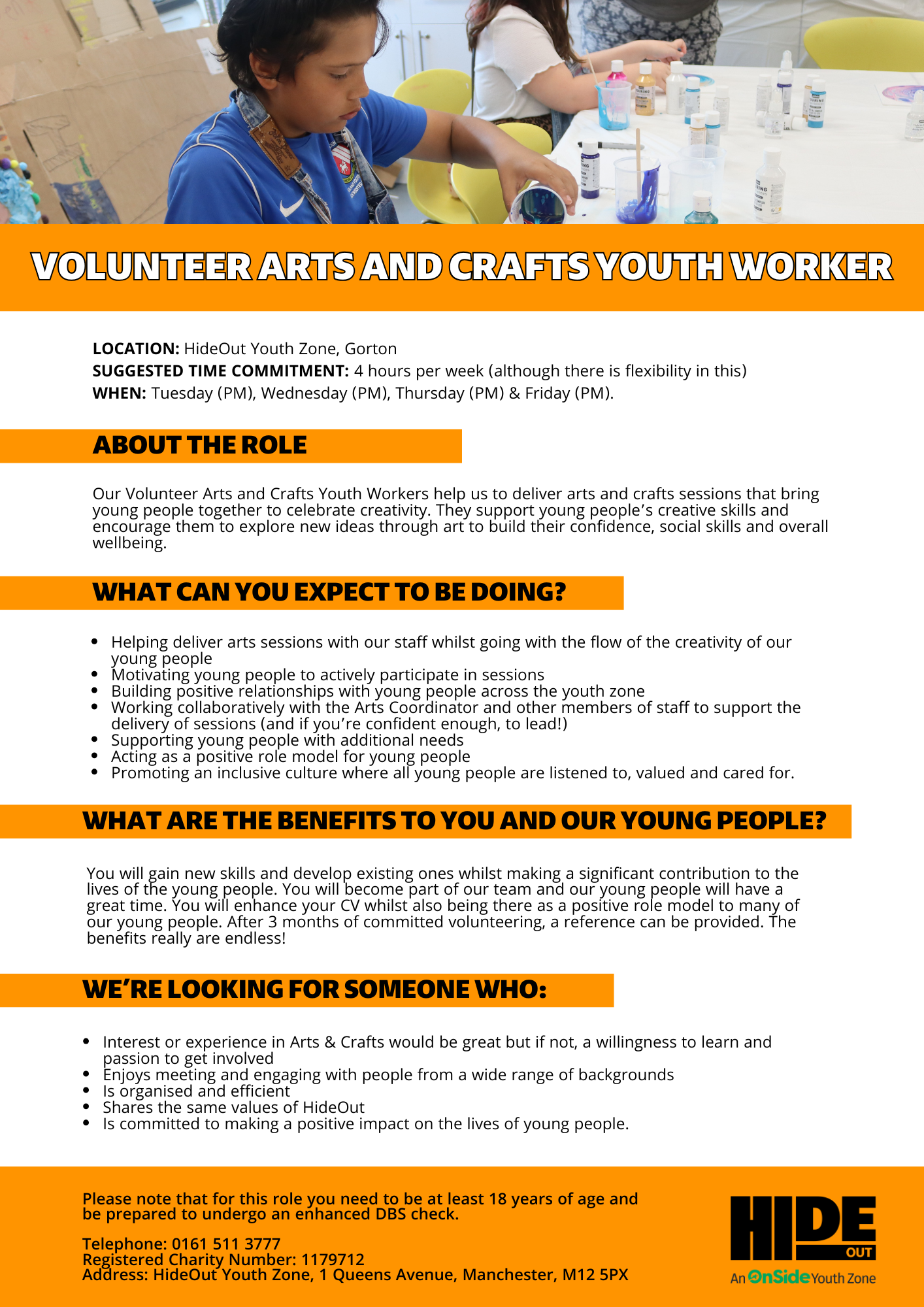 Our Volunteer Arts and Crafts Youth Workers help us to deliver arts and crafts sessions that bring young people together to celebrate creativity. They support young people’s creative skills and encourage them to explore new ideas through art to build their confidence, social skills and overall wellbeing.